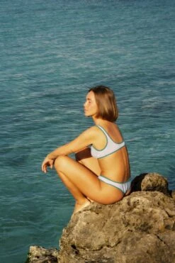 This light blue bikini bottom with green binding is made for tanning, splashing & swimming 🩵 With a high-leg cut & cheeky-cut back, it’s both sporty & flattering. Topped off with a small reflective planet detail & full UV protection (just don’t forget the SPF for the bits not covered by your bikini) 🌞