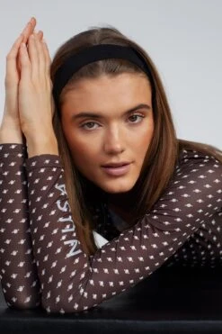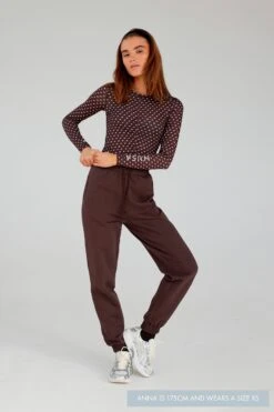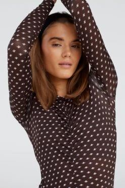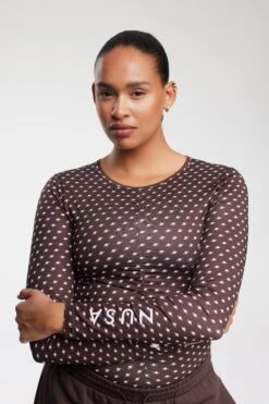 Sleek and shiny long sleeve in chocolate brown with small white planets all over 🪐🪐